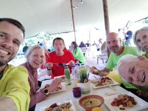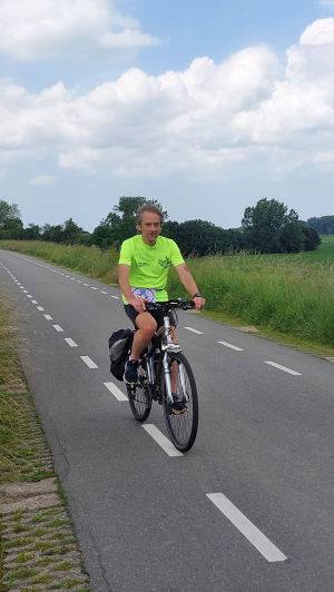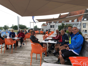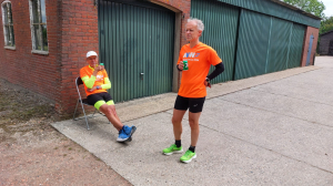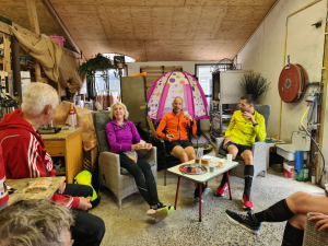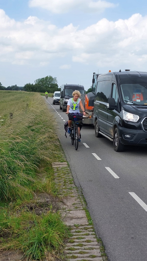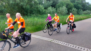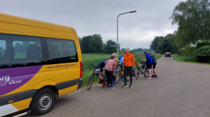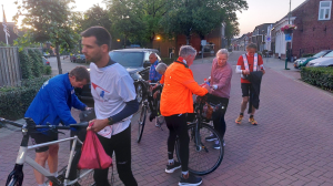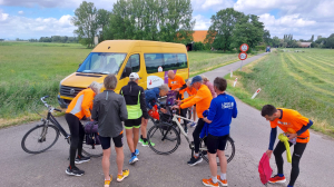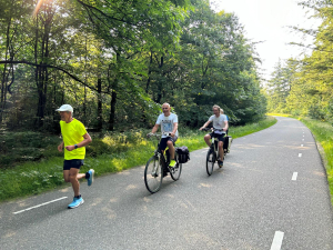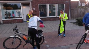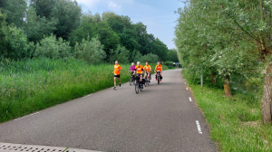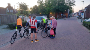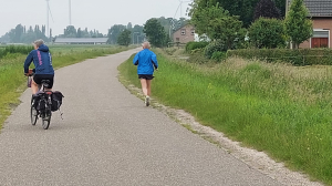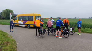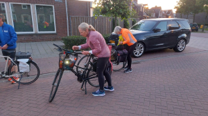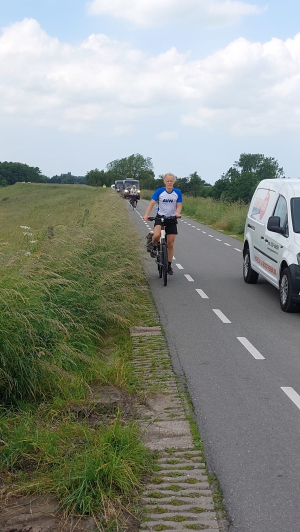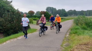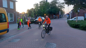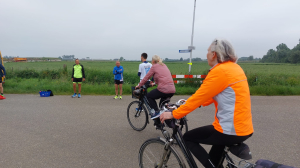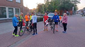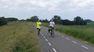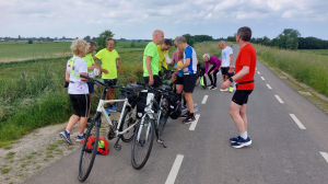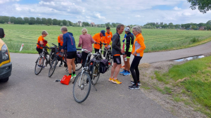 Joris, Robin, Dionne, Marianne en Peter vormden het eerste team dat in de eerste etappe al fietsend en lopend 42 km aflegde naar Moerkapelle, alwaar team 2 met Martin, Ron, Bert, Anita en Ruud ‘het stokje’ overnam tot Lopikerkapel (84 km) aan het begin van de lange Lekdijk. In tegenstelling tot de hete editie van 2023 werd er niet unaniem voor korte kleding gekozen want met windkracht 4 (weliswaar in de rug), een waterig zonnetje en maximaal 15 graden kan je op de fiets onaangenaam afkoelen.